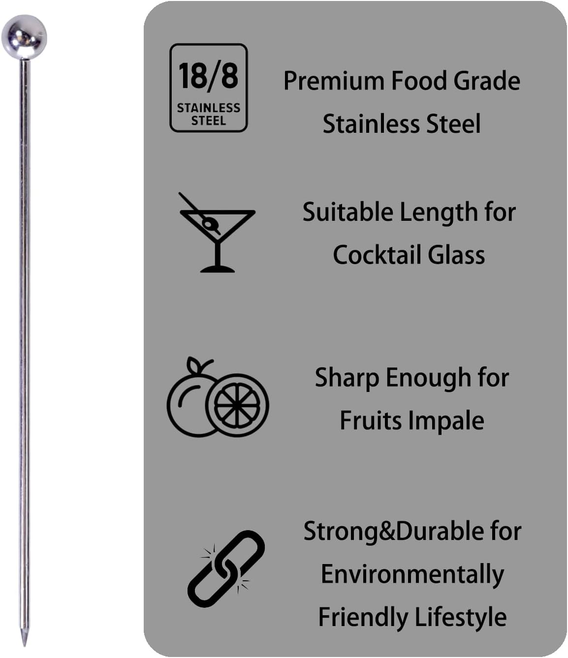 - Durable Elegance: Crafted from food-grade Stainless Steel 304, our picks are corrosion-resistant, unbreakable, and rustproof. The sleek silver-tone holder complements their quality, creating an enduring set for your drink garnishing needs.