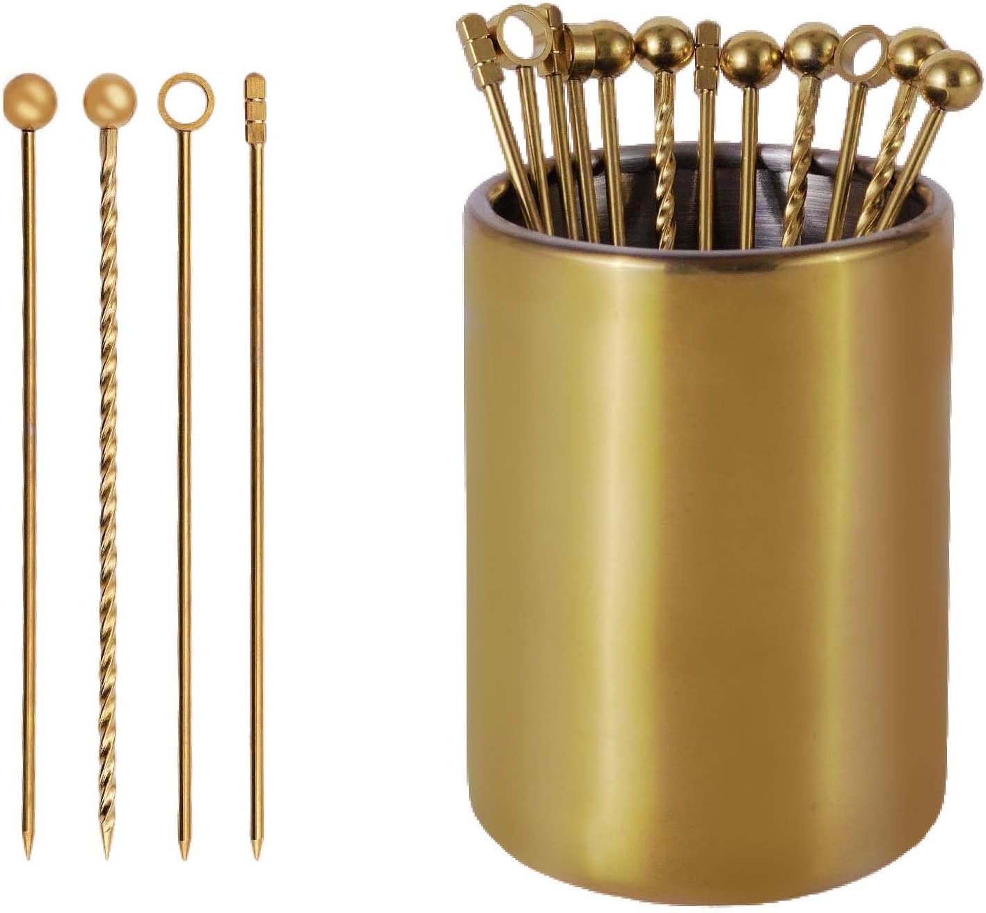 - Package Includes: A 12-piece set of gold screw-thread 4style cocktail picks and a compact gold stainless steel holder (2.2"L x 2.2"W x 3.1"H)