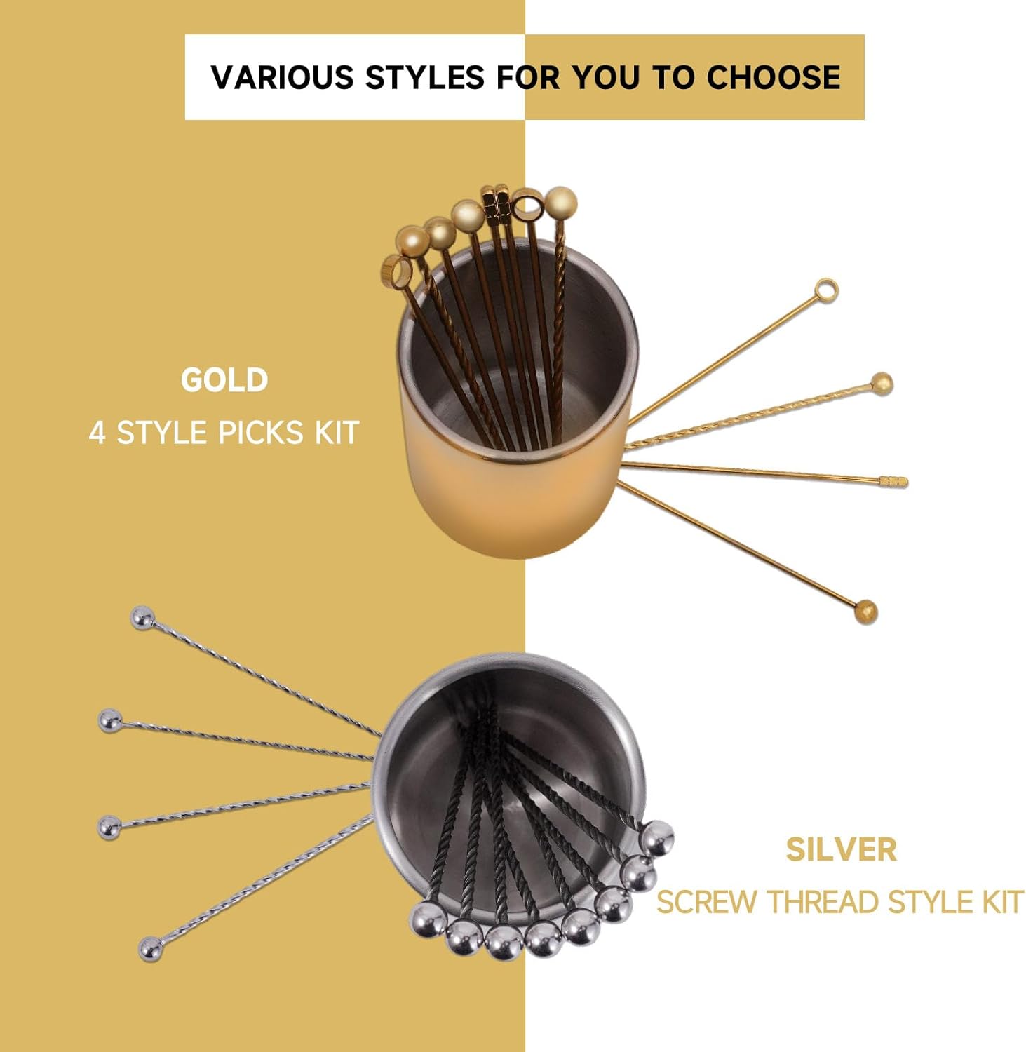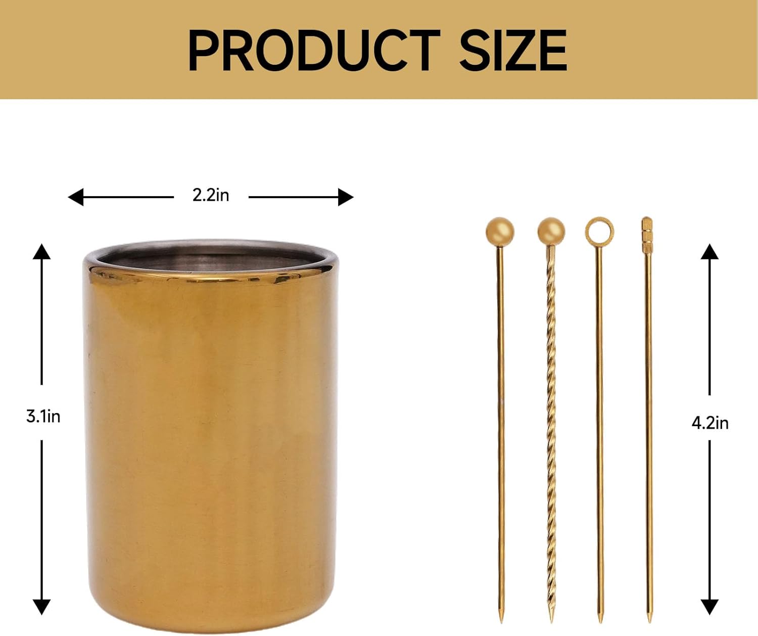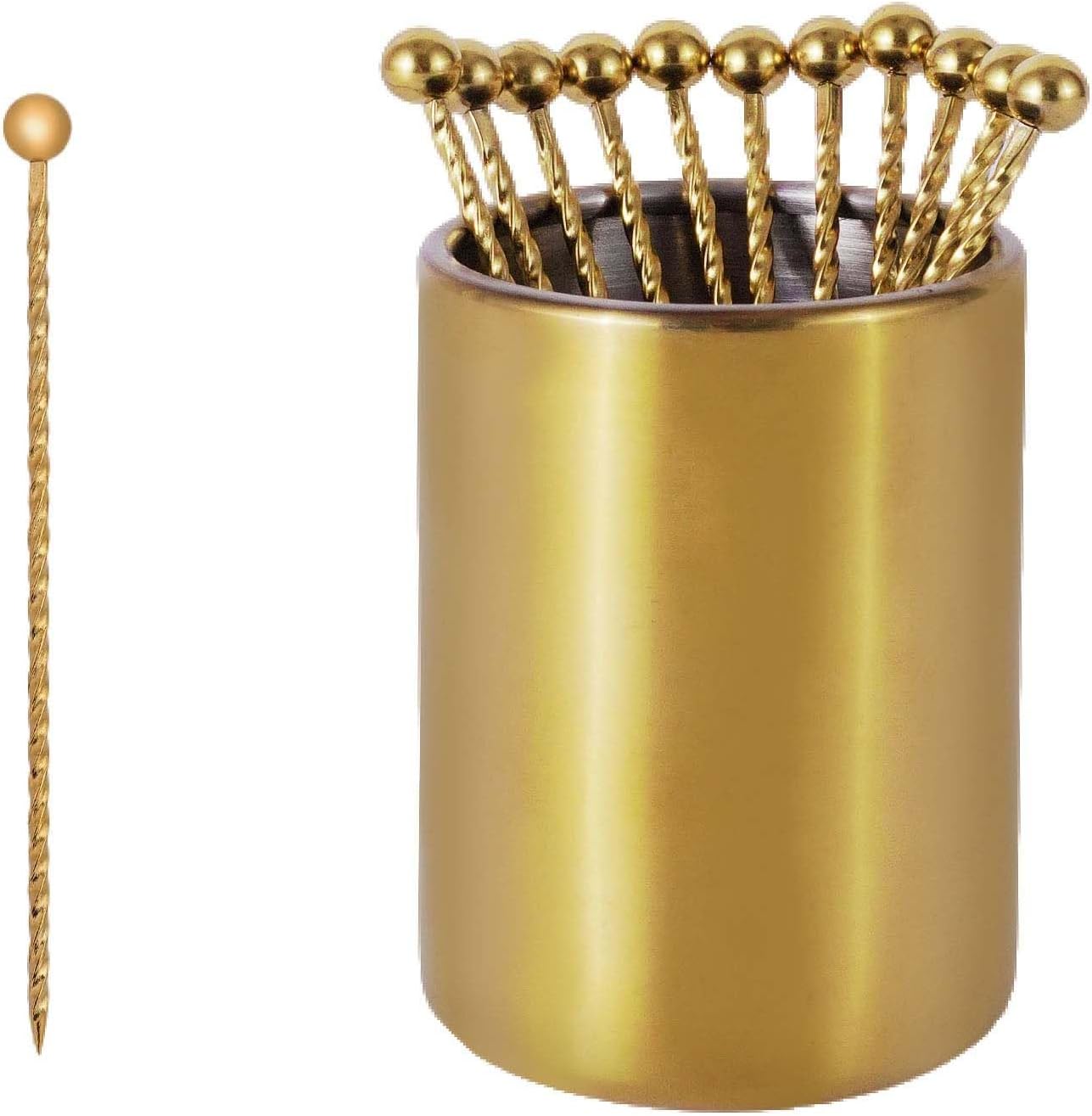 - Package Includes: A 12-piece set of gold screw-thread cocktail picks and a compact gold stainless steel holder (2.2"L x 2.2"W x 3.1"H)