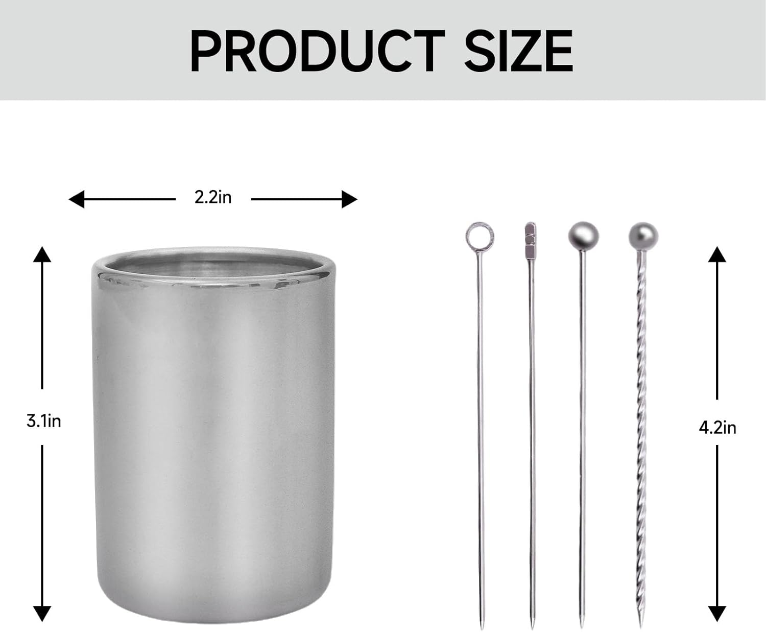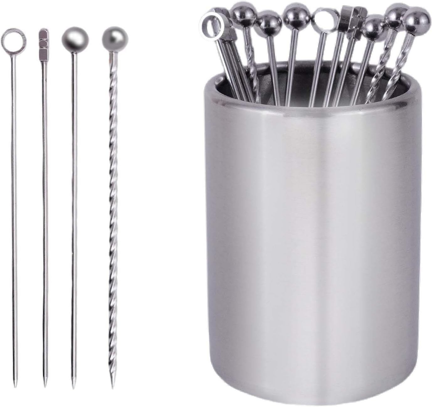 - Package Includes: A 12-piece set of silvery 4styles screw-thread cocktail picks and a compact silvery stainless steel holder (2.2"L x 2.2"W x 3.1"H)