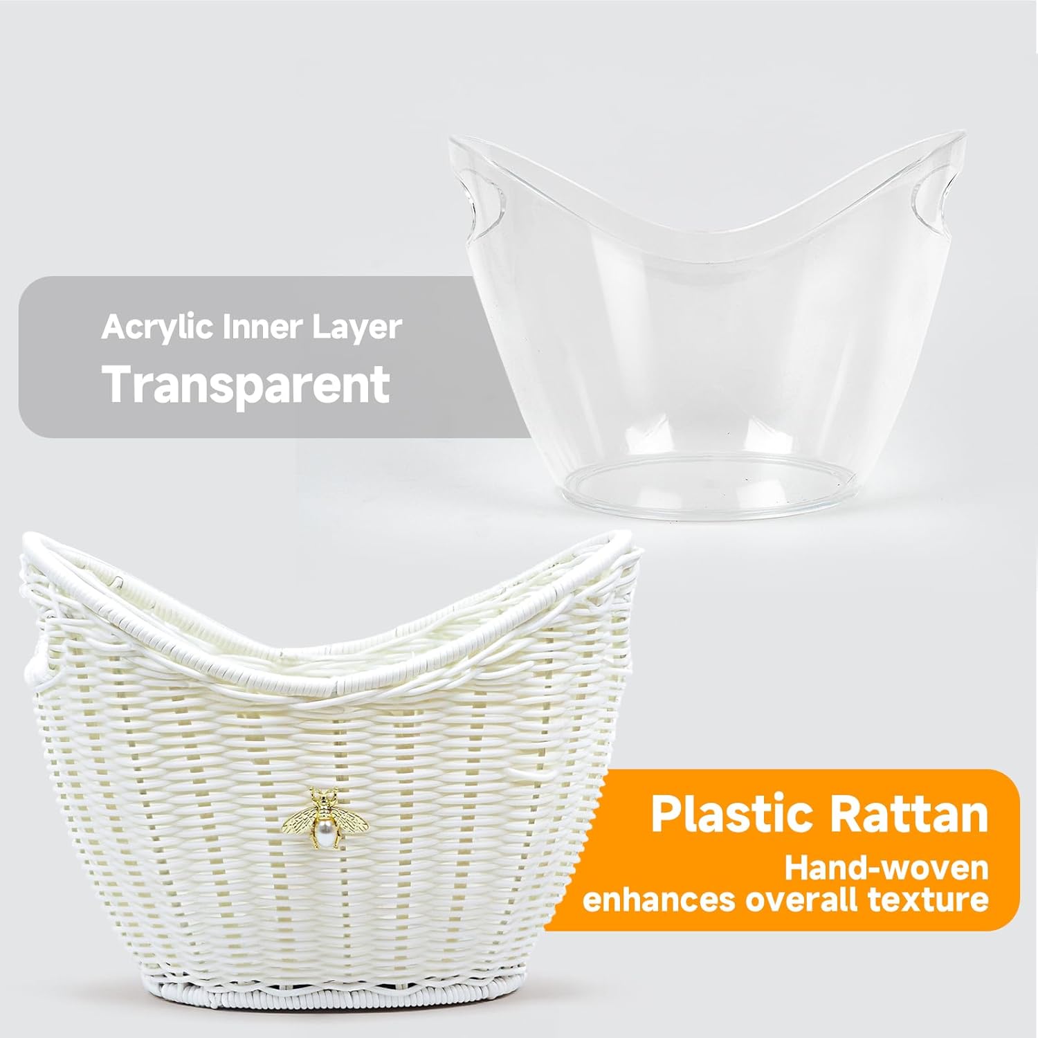 - Exquisitely Crafted & Versatile : The hand-woven rattan exterior, adorned with charming metal pearl bees, adds a touch of elegance to any setting. The separable double-layer design offers versatility, allowing you to use the inner acrylic bucket on its own for smaller occasions or combine it with the outer basket for a more substantial display. Ideal for gatherings, housewarmings, and picnics alike.