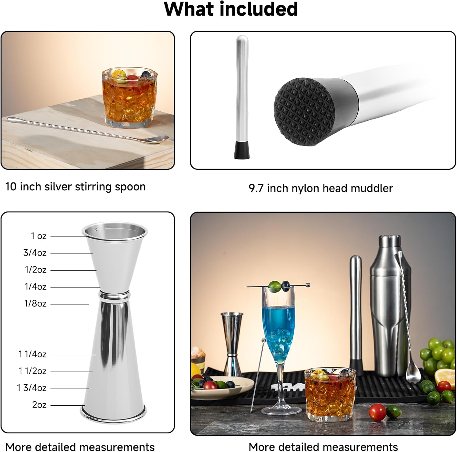 - All-in-One Cocktail Kit: Includes everything you need for professional-level cocktail making: 24oz double-wall shaker, muddler, bar spoon, 1oz/2oz jigger (with 1/8 oz measurements), cocktail picks, plus carrying case and shaker bag—perfect for any bartender.
